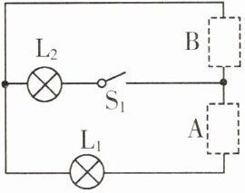 12.(新编)在如图所示的电路图中的两个虚框内分别接上电源和开关$S_{2}$,当只闭合开关$S_{2}时只有L_{1}$发光,当只闭合开关$S_{1}$时两灯均发光,则A框内应填______的符号,B框内应填______的符号。