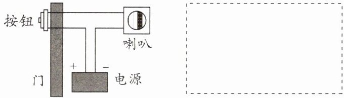 (在虚线框内画出电路图,电路组成:电源、按钮开关、喇叭依次串联,电源正负极正确,开关符号、喇叭符号(用指定符号)规范连接)