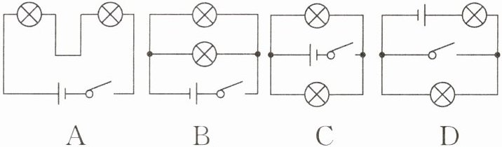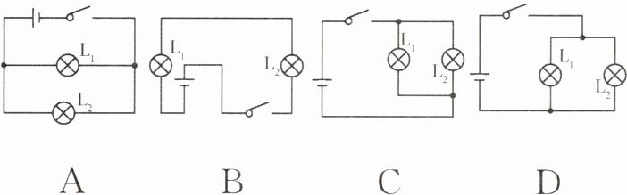 分析选项D:两个灯泡并列连接,电流有两条路径,开关在干路,是并联电路,符合要求。