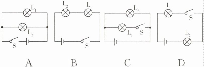 变式训练3 在如图所示的电路中,闭合开关S,小灯泡$L_{1}$、$L_{2}$并联的是 ( )