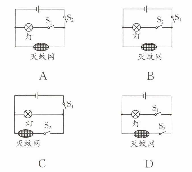 4.(梧州中考)如图所示的电蚊拍具有灭蚊和照明的功能。当只闭合开关$S_{1}$时,电蚊拍只起到灭蚊的作用;当同时闭合开关$S_{1}$、$S_{2}$时,电蚊拍同时起到灭蚊和照明的作用。下列电路设计符合要求的是( )