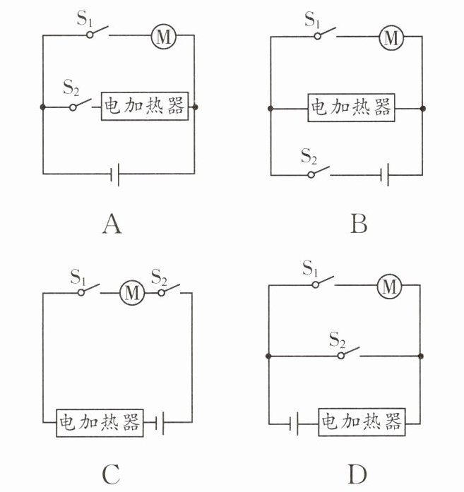D选项:S₂闭合会短路电加热器,不符合。