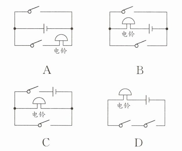 2.(新编)自动售票公交车后门两侧的扶手上各装有一个红色按钮(如图所示),想要下车的乘客只要按下其中任何一个按钮,装在车内的电铃就会响起,以提醒司机停车。如图所示的电路图符合要求的是( )