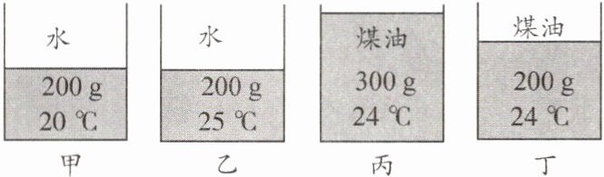 5. (新编)如图所示,四个完全相同的烧杯放在同一水平桌面上,甲容器中水的内能______乙容器中水的内能,丙容器中煤油的内能______丁容器中煤油的内能。(两空均选填“大于”“