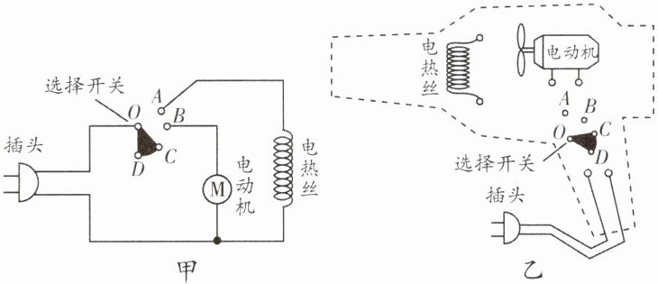 13.(新编)图甲是电吹风的电路图,图乙是电路元件实物图,选择开关绕O点转动,可分别置于OAB、OBC、OCD三个位置,使电吹风分别处于“热风挡”“冷风挡”“停止”三种状态。请根据图甲的电路图将图乙的实物电路图补画完整。