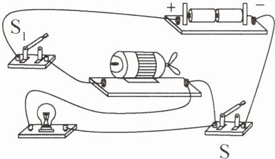 11.(新编)在下面的电路中,有一根导线连接错误,请将错误导线用“×”标出,并画出正确的连接方式。要求:改正后,灯泡和电动机并联,开关S控制所有的用电器,开关$S_{1}$只控制电动机。
