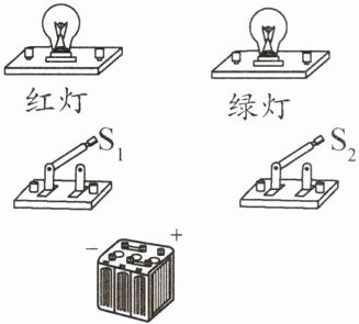 图略(将红灯与开关$S_1$串联后,再与绿灯并联,最后与电源、开关$S_2$串联在电路中)。