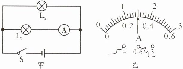 11.(新编)在如图甲所示的电路中,当开关S闭合后,电流表的指针偏转如图乙所示,则电流表所用量程为______A,电流表的示数为______A,通过灯泡$L_{1}$的电流为______A。