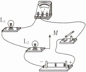 8.(新编)在如图所示的电路中,要求$L_{1}$、$L_{2}$并联,电流表只测通过$L_{1}$的电流时,线头M应接在电流表的______接线柱上;电流表测干路电流时,线头M应接在电流表的______接线柱上。