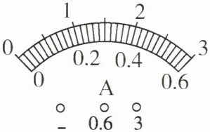 6.(新编)小菲同学在使用电流表测量某电路中通过小灯泡的电流时,测得电流为$0.34 \text{ A}$。请你在如图所示电流表的示意图中,用笔画线标出此时电流表的接线和指针所指的位置。