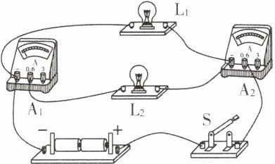 电源正极 ──── 开关S ──── 电流表A₂ ────┬──── 灯泡L₁ ────┐