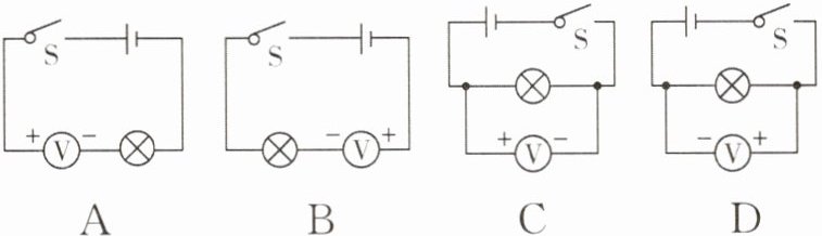 C选项:电压表与灯泡并联,电流从正接线柱流入、负接线柱流出,正确。