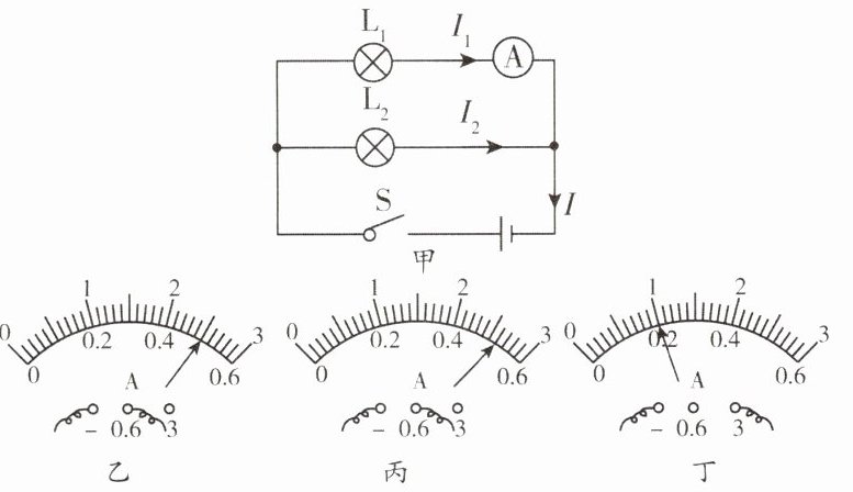 (1)她测出了$L_{1}$、$L_{2}支路和干路中的电流分别为I_{1}$、$I_{2}和I$,电流表示数如图乙、丙、丁所示,可读出:$I_{1}= 0.5A$,$I_{2}= $____$A$,$I= $____$A$。根据测量结果,在误差允许范围内你认为并联电路中干路里的电流和各支路中的电流的关系是____(写出关系式即可)。