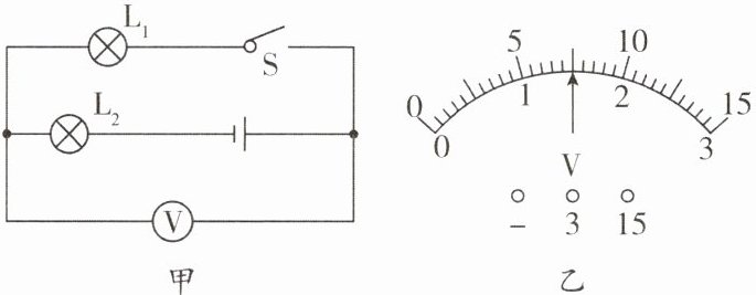 解:由图甲可知,两灯串联,电压表测$L_{1}$两端电压。电源电压6V,电压表若接0-15V量程,分度值0.5V,指针指在7.5V(超电源电压,舍去);若接0-3V量程,分度值0.1V,指针指在1.5V。故$U_{1}=1.5V$。串联电路总电压等于各部分电压之和,$U_{2}=U-U_{1}=6V-1.5V=4.5V$。