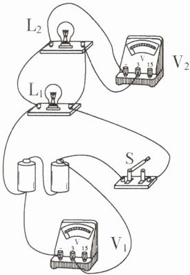 解:由电路图可知,两灯泡串联,电压表V₁并联在L₁两端,测L₁两端电压,故L₁两端电压U₁=3V;电压表V₂并联在L₂两端,测L₂两端电压,故L₂两端电压U₂=3V。串联电路总电压等于各部分电路电压之和,电源电压U=U₁+U₂=3V+3V=6V。