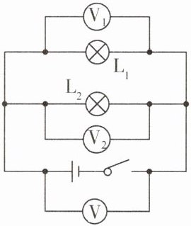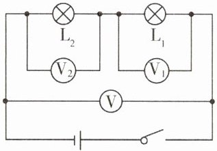 变式训练2 在如图所示的电路中,电压表$V_{1}$的示数是3V,电压表$V_{2}$的示数也是3V,则灯泡$L_{1}$两端的电压是______V,灯泡$L_{2}$两端的电压是______V,电源两端的电压是______V。