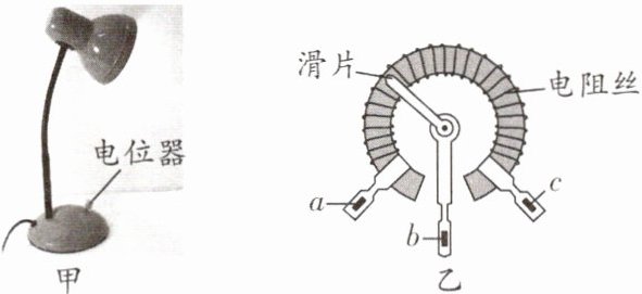 17. (新编)如图甲所示为某可调节亮度的台灯。图乙为其用于调光的电位器结构图,a、b、c 是它的三个接线柱,a、c 分别与弧形电阻丝的两端相连,b 与金属滑片相连,转动旋钮,滑片在弧形电阻丝上同向滑动即可调节灯泡的亮度。电位器是通过改变接入电路中电阻丝的 ______ 来改变灯泡亮度的;若只将 b、c 接入电路,顺时针转动旋钮时灯泡的亮度将 ______。