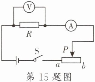 15. (新编)如图所示,电阻$R = 10\Omega$。闭合开关$S$,调节滑动变阻器的滑片$P$在某一位置时,电流表的示数为0.5A,则电压表的示数为______V。若要使电压表的示数为6V,滑片$P$应向______(选填“$a$”或“$b$”)端滑动。