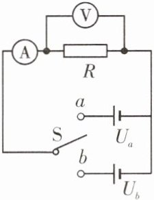 13. (新编)如图所示,电源$U_a = 6V$,电源$U_b = 18V$,电阻$R = 6\Omega$。则开关$S接a$时,电流表的示数为______A,电压表的示数为______V;开关$S接b$时,电流表的示数为______A,电压表的示数为______V。