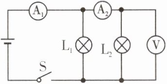 12. (新编)如图所示,开关S闭合,两个灯泡均正常发光,电流表$A_{1}$的示数为0.8A,电流表$A_{2}$的示数为0.5A,电压表V的示数为8V。下列判断不正确的是( )