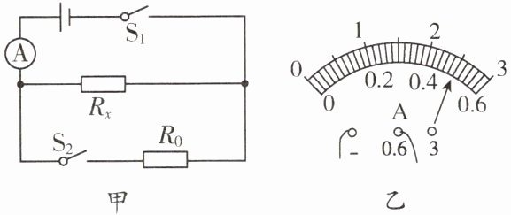 变式训练2 小张根据老师提供的器材设计了如图甲所示的电路,已知电源电压恒定不变,$ R_0 = 18 \, \Omega $。当只闭合开关 $ S_1 $ 时,电流表的示数为 $ 0.3 \, \text{A} $;当开关 $ S_1 $、$ S_2 $ 均闭合时,电流表的示数如图乙所示。电源电压为____ $ \text{V} $,$ R_x $ 为____ $ \Omega $。