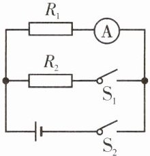 【例2】如图所示的电路,电阻 $ R_1 $ 的阻值是 $ 20 \, \Omega $。当开关 $ S_2 $ 闭合、$ S_1 $ 断开时,电流表的示数是 $ 0.3 \, \text{A} $;当开关 $ S_1 $、$ S_2 $ 都闭合时,干路中的电流是 $ 0.5 \, \text{A} $。