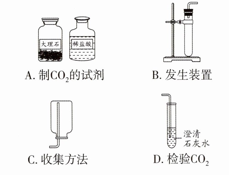 C 解析:通常情况下二氧化碳的密度大于空气的密度,故能用向上排空气法收集,A正确;二氧化碳能溶于水,与水反应,一般不用排水法收集,B正确;碳酸钠粉末和稀盐酸反应速率太快,不利于气体收集,应用块状碳酸钙和稀盐酸反应,C错误;碳酸钙和稀盐酸在常温下即可迅速反应,属于固液常温型,故气体发生装置不需要加热,D正确。