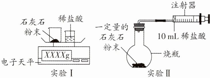 (4)①已知实验Ⅰ反应前的总质量[$m$(大烧杯+石灰石粉末)+$m$(小烧杯+稀盐酸)],要计算生成$CO_{2}$的质量,至少还需要的数据是