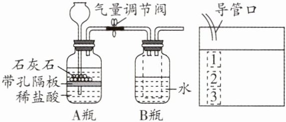 (2)由图可推知,关闭气量调节阀,二氧化碳气体不能排出,A瓶内气体增多,压强变大,稀盐酸被压进长颈漏斗中与大理石脱离接触,反应停止,打开气量调节阀,二氧化碳气体排出,A瓶内压强变小,稀盐酸进入A瓶内与大理石接触,反应发生。所以二氧化碳是否产生与A瓶内的压强有关。