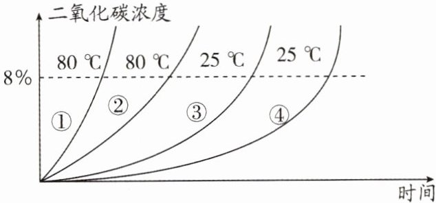 7. 思想方法 对比法 某兴趣小组为探究影响化学反应速率的因素,使用等量的同种钙片和白醋开展四组实验,分别测得产生二氧化碳的浓度随时间的变化曲线如图所示。选取$CO_2$浓度从0~8%为研究对象,下列实验结果的分析,正确的是 (