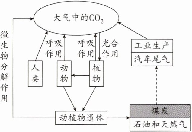 D 解析:植物光合作用利用二氧化碳和水生成有机物和氧气,则植树造林有利于吸收大气中的二氧化碳,A正确;二氧化碳是光合作用的原料,可促进植物的光合作用,利于植物生长,是最好的气体肥料,B正确;二氧化碳和水反应生成碳酸,显酸性,大气中二氧化碳含量持续偏高,会导致海洋酸化,C正确;冬季绿色植物的光合作用减弱,还需要燃烧大量的化石燃料取暖,则同一年度中,二氧化碳的含量冬季会明显高于夏季,D错误。