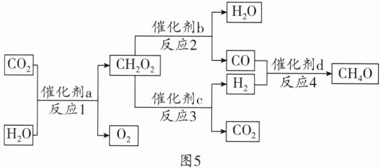 (6)①反应1为二氧化碳和水在催化剂a的催化作用下生成CH₂O₂和O₂;②甲酸在催化剂b、c的作用下生成的物质不同,则对催化剂新的认识是反应物相同,催化剂的种类不同,生成物有可能不同;③由图5可知,水和二氧化碳既是反应物又是生成物,则可循环利用的物质是水和二氧化碳。