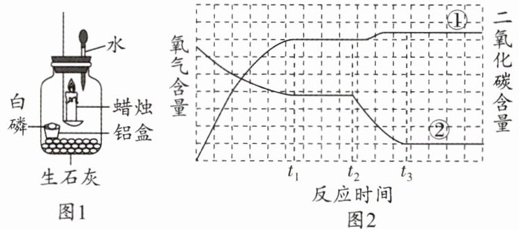 小组同学利用图1装置探究燃烧的条件,点燃蜡烛后立即塞紧橡皮塞,待蜡烛熄灭后,将滴管中的水全部滴入集气瓶中,铝盒中的白磷立即燃烧。生石灰(CaO)遇水会生成熟石灰[Ca(OH)₂],放出大量的热。图2是瓶中①CO₂和②O₂的含量随时间变化的图像。