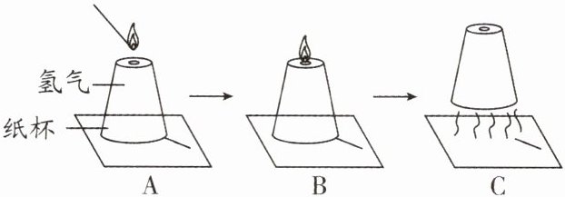 7. 取一只纸杯,在底部开一小孔,倒置在实验桌上(倒置时纸杯下垫木条使纸杯的下边缘一端稍稍抬起),用纸团堵住小孔,先收集满氢气后,拿掉堵小孔的纸团,用燃着的长木条在小孔处点燃氢气,实验过程如图所示: