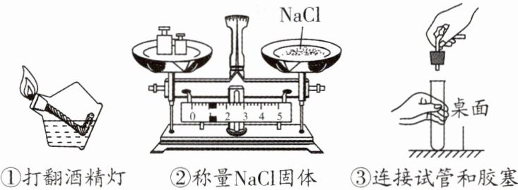 ①打翻酒精灯 ②称量NaCl固体 ③连接试管和胶塞