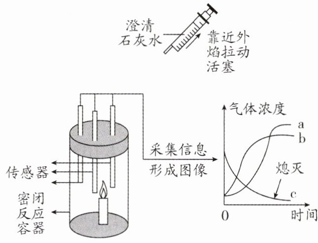 B 解析:蜡烛燃烧生成二氧化碳,二氧化碳能使澄清石灰水变浑浊,A正确;蜡烛燃烧生成二氧化碳和水,则曲线a和b是二氧化碳和水蒸气,所以c为氧气,B错误;石蜡燃烧生成的水蒸气会冷凝成小水珠,所以实验结束后可观察到反应容器内壁有少量水珠,C正确;由图可知,曲线c(氧气含量)低于一定值时,蜡烛会熄灭,则说明有氧气时蜡烛也不一定能燃烧,D正确。