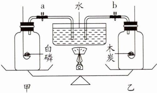 8. C 解析:白磷点燃后,应快速伸入集气瓶并塞紧橡皮塞,以防止瓶内气体受热逸出,造成实验误差,A错误;白磷燃烧生成五氧化二磷,木炭燃烧生成二氧化碳气体,则反应后甲中压强减小,打开弹簧夹a、b一段时间后,流入集气瓶甲中的水多,B错误;打开弹簧夹之前,甲、乙质量相等,打开弹簧夹后,进入甲中的水较多,则天平指针向左偏转,C正确;若白磷足量,由于氧气约占空气体积的五分之一,则集气瓶甲中消耗氧气的体积约为$\frac {1}{5}L$,D错误。