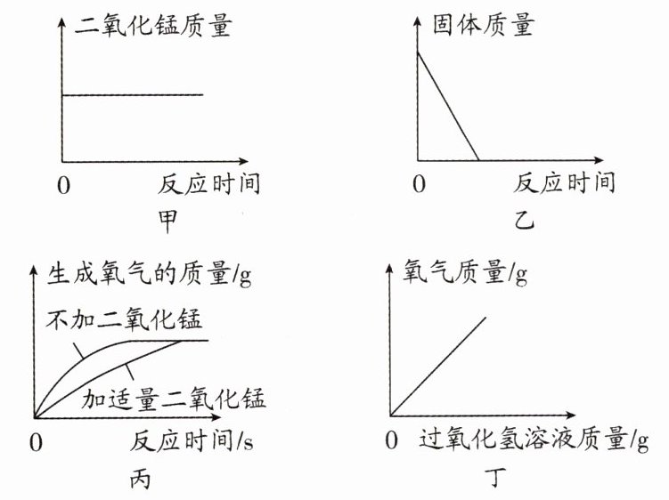D 解析:加热高锰酸钾生成锰酸钾、二氧化锰和氧气,反应前二氧化锰质量为0,随着反应的发生二氧化锰质量逐渐增大,直至完全反应,A错误;加热高锰酸钾生成锰酸钾、二氧化锰和氧气,由于有气体产生,所以固体质量逐渐减小,由于生成的锰酸钾和二氧化锰是固体,所以最终固体质量不为0,B错误;加入二氧化锰的过氧化氢分解速率快,斜率较大,最终产生氧气质量相等,C错误;过氧化氢在二氧化锰作催化剂的条件下分解产生氧气,产生氧气的质量随着反应的过氧化氢质量增大而增大,D正确。
