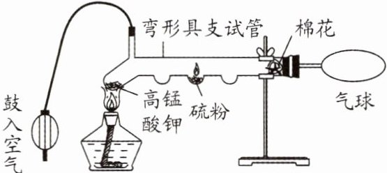 9. (2025·长沙期中)利用如图装置进行“硫燃烧”的实验:向弯形具支试管中鼓入空气,同时用酒精灯给硫粉加热至燃烧;然后停止鼓入空气,再用另一盏酒精灯给高锰酸钾加热。下列关于该实验的说法不正确的是(