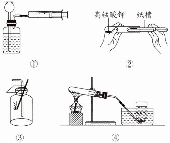 A 解析:图示中,长颈漏斗下端浸没在水面下,向右拉活塞,若装置气密性良好,装置内的气压将减小,外界大气压会将空气压进装置内,长颈漏斗下端管口应该有气泡产生;若装置气密性不好,装置内外气压几乎相等,看不到导管口有气泡产生的现象,A正确;向试管内加入高锰酸钾,可用纸槽取适量高锰酸钾送到试管底部,然后将试管直立,若送到试管口,高锰酸钾将沾到试管壁上,B错误;检验集气瓶内氧气是否收集满,应将带火星的木条放在集气瓶口,而不是伸入集气瓶内,木条复燃则已收集满,C错误;导管口刚开始冒出的气泡主要是装置内的空气,此时就将导管伸入集气瓶内,收集的氧气不纯净,应该等导管口气泡连续均匀冒出时才开始收集,D错误。