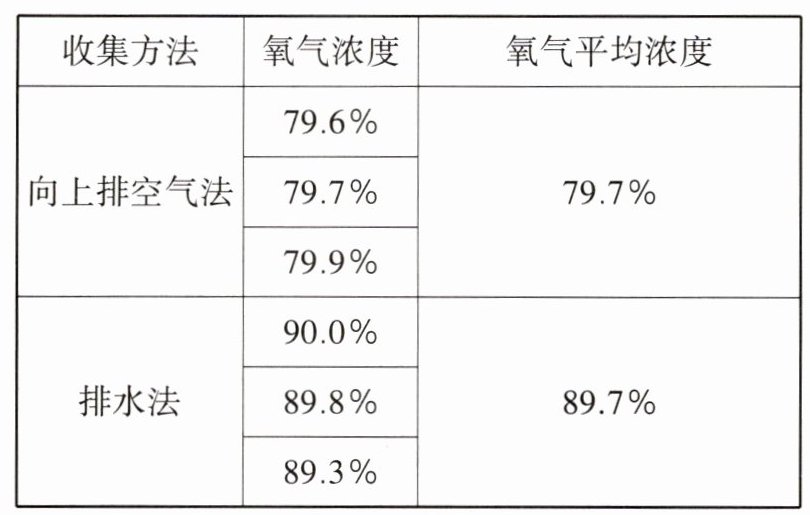 B 解析:用排水法收集氧气时,当观察到集气瓶口有较大气泡冒出时,则说明收集满,A正确;由表中数据可知,排水法收集到的氧气平均浓度更高,更纯净,B错误;用排水法收集到的气体不纯,主要是因为排水法收集的氧气中混有水蒸气,C正确;用向上排空气法收集时,应将带火星的木条放在集气瓶口,若木条复燃,则说明已收集满,而根据表中数据可知,用向上排空气法收集到的氧气浓度约为80%,则说明当观察到带火星的木条复燃时,集气瓶内还有空气,D正确。