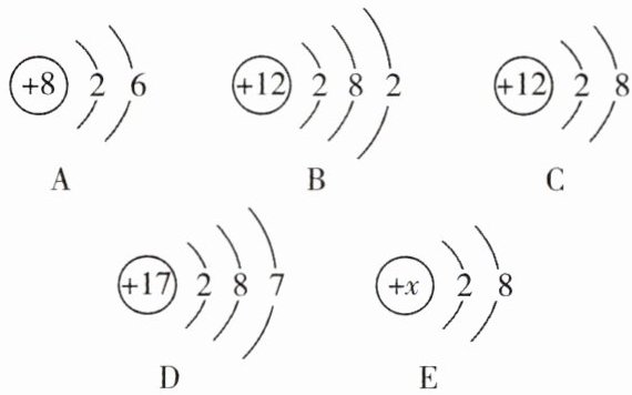 (4)若E中x= 9,其元素对应的原子化学性质与A、B、C、D中