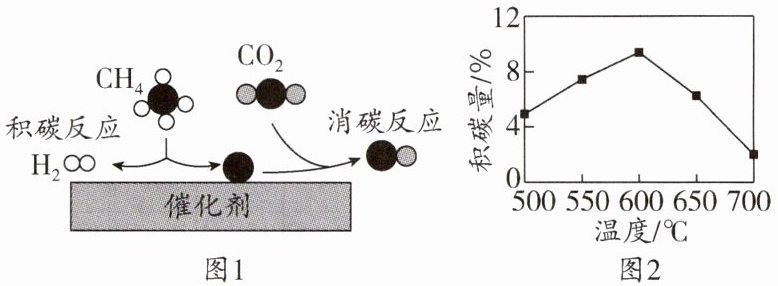 D 解析:图2中温度高于$600^{\circ}C$,催化剂表面积碳量减少的原因可能是温度升高,消碳反应所消耗的碳的量多于积碳反应产生的碳,D错误