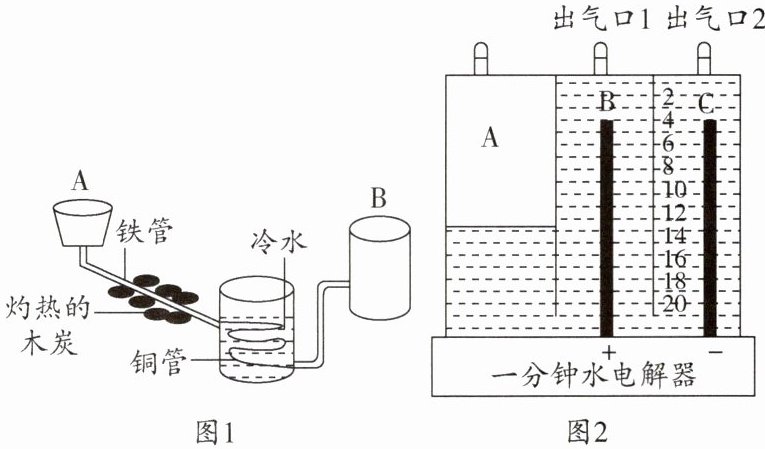 【经典回顾】(1)1783年,拉瓦锡利用如图1所示装置探究水的组成。往A杯中滴加少量的水,水通过灼热的铁管时发生汽化,水蒸气与灼热的铁反应,生成一种黑色固体四氧化三铁和“可燃空气”,将气体通过放在冷水中的铜管,在B装置中收集到纯净的“可燃空气”。最终拉瓦锡证明了水的组成。