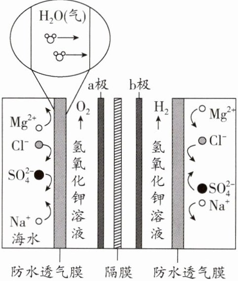 B 解析:电解水时,生成的氢气和氧气的体积比为2:1,A错误;根据示意图,气态的水分子可通过防水透气膜,B正确;电解水时,正极产生氧气,负极产生氢气,a极产生氧气,则与电源的正极相连,C错误;由于钠离子和氯离子不能透过透气膜,则得到的水为淡水,D错误。