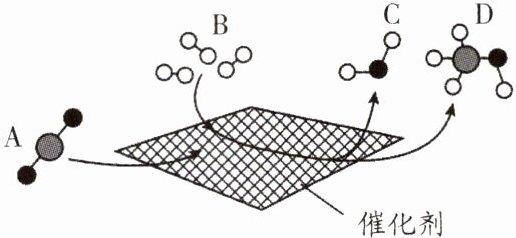 (1)工业上一种制取$H_{2}的方法为CO+H_{2}O\xlongequal [△]{催化剂}CO_{2}+H_{2}$,其生成物$CO_{2}和H_{2}$在一种新型催化剂作用下进一步反应,其反应的微观过程模型示意图如图,从该示意图可以判断生成物C与D的分子个数比为