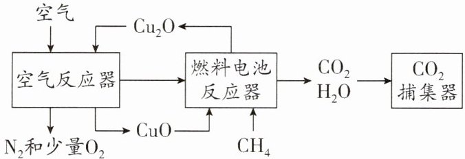 C 解析:由题图可知,$CuO$、$Cu_{2}O$均既是反应物,又是生成物,可循环使用,所以流程中不需要另外添加$CuO$,A正确;由题图可知,空气反应器中的反应为氧化亚铜和空气中的氧气加热生成氧化铜,B正确;理论上燃料电池是将化学能转变为电能,C错误;由题图可知,该流程可以分离出二氧化碳,实现低能耗捕集$CO_{2}$,D正确。