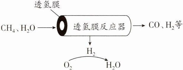 10. 新情境(2025·泉州期中)工业上常利用甲烷$(CH_{4})$催化制取氢气。一种甲烷水蒸气催化制氢的透氢膜反应器如图所示(已知:膜是具有选择性分离功能的材料),通入的甲烷和水蒸气在高温和催化剂作用下反应生成一氧化碳(CO)和氢气(该反应是吸热反应),一部分氢气通过透氢膜与膜外侧通入的氧气反应。下列说法不正确的是 (