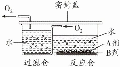 3. (2025·南京期中节选)学习氧气制取后,学习小组开展了“设计和制作简易供氧器”的实践活动。化学小组制作了一台简易“制氧机”如图所示。用A剂、B剂产生氧气,其中A剂为白色颗粒($2Na_{2}CO_{3}\cdot 3H_{2}O_{2}$),B剂为$MnO_{2}$。用该装置制取氧气时,在反应仓中加入适量的水,再依次加入A剂和B剂即可持续、平稳地产生氧气。