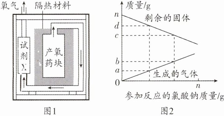 2. (2024·厦门期末)图1是某潜水艇紧急供氧设备的结构示意图。产氧药块主要成分是氯酸钠($NaClO_{3}$),氯酸钠受热分解生成氯化钠和氧气,同时发生副反应产生少量有毒的氯气。ng氯酸钠分解过程中各物质质量变化如图2所示,下列说法错误的是 (